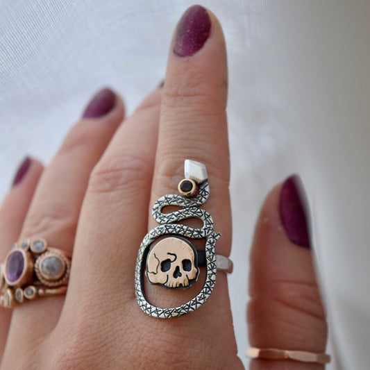Serpent and Skull Ring with Gold Fill and Smokey Quartz Size 7