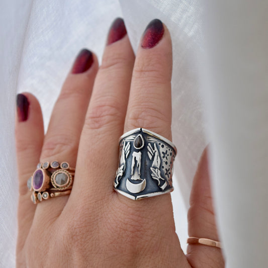 Black Flame Candle Shield Ring with Black Star Sapphire size 7.5