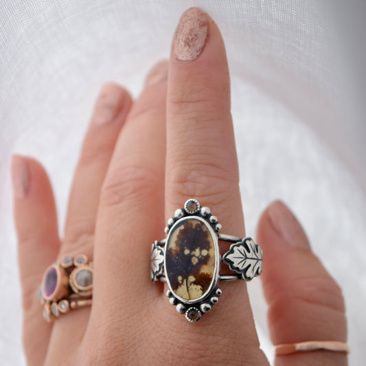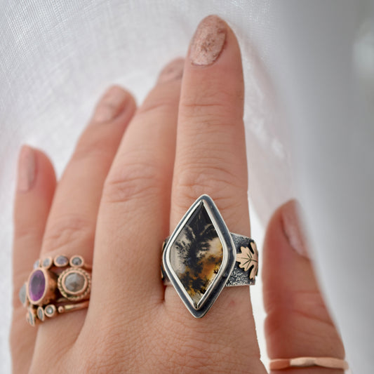 Oak Leaf Ring with rare Scenic Dendritic Agate and Smokey Quartz size 10