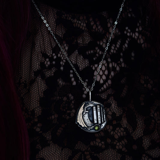 Lunar Bookshelf Necklace with Gold Fill and Green Tourmaline
