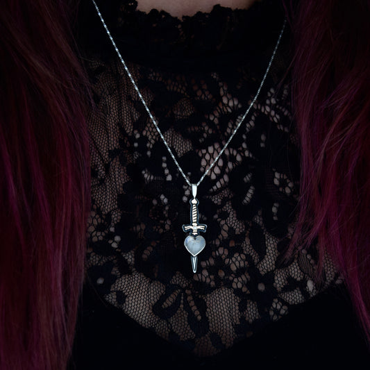 Dagger Necklace with Rainbow Moonstone, Moissanite, and Rose Gold Fill