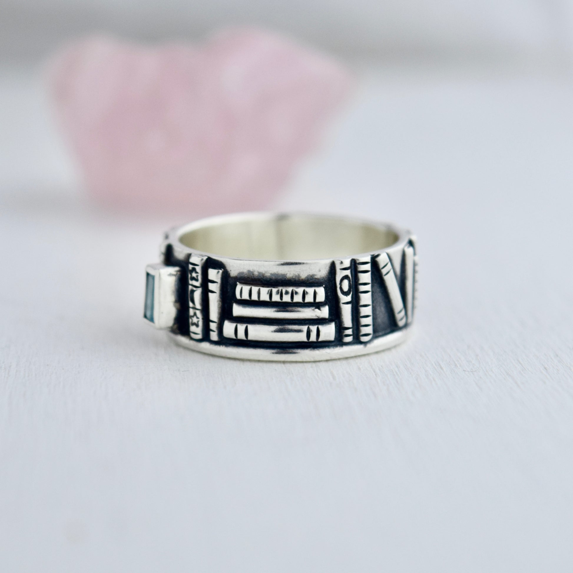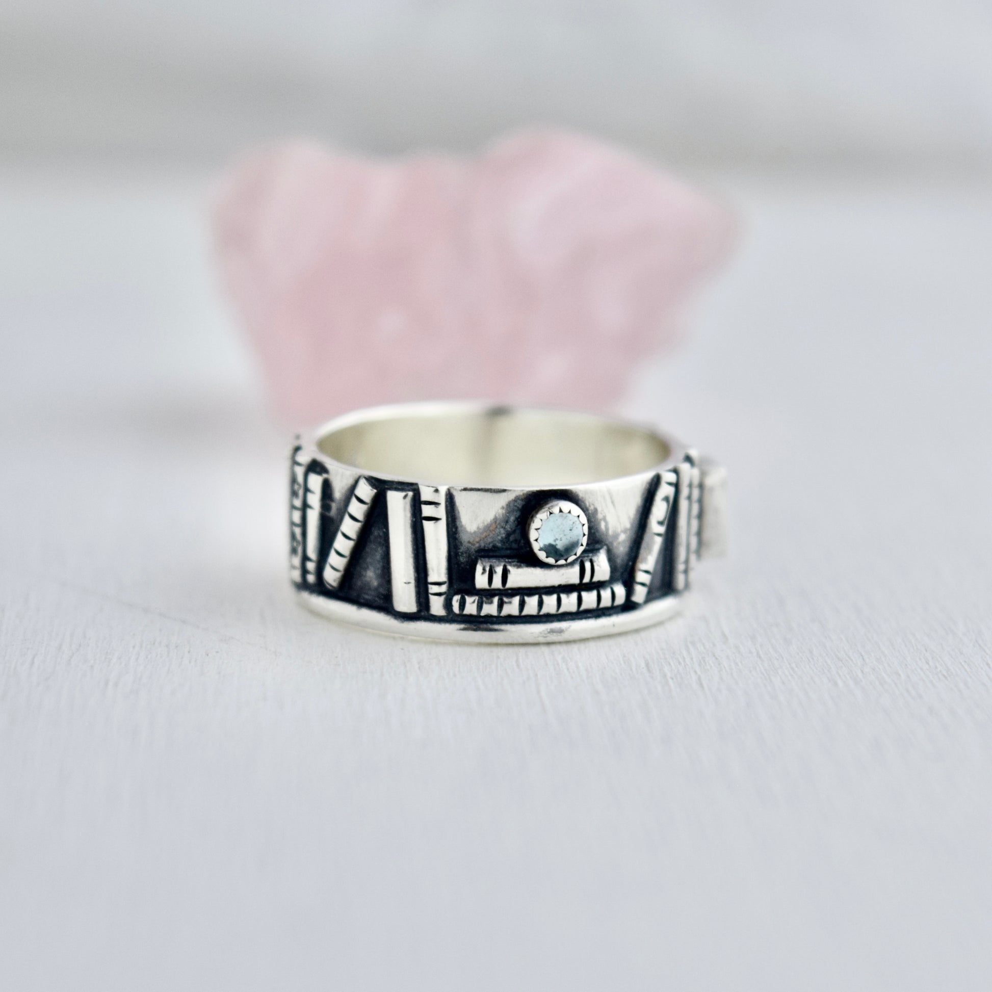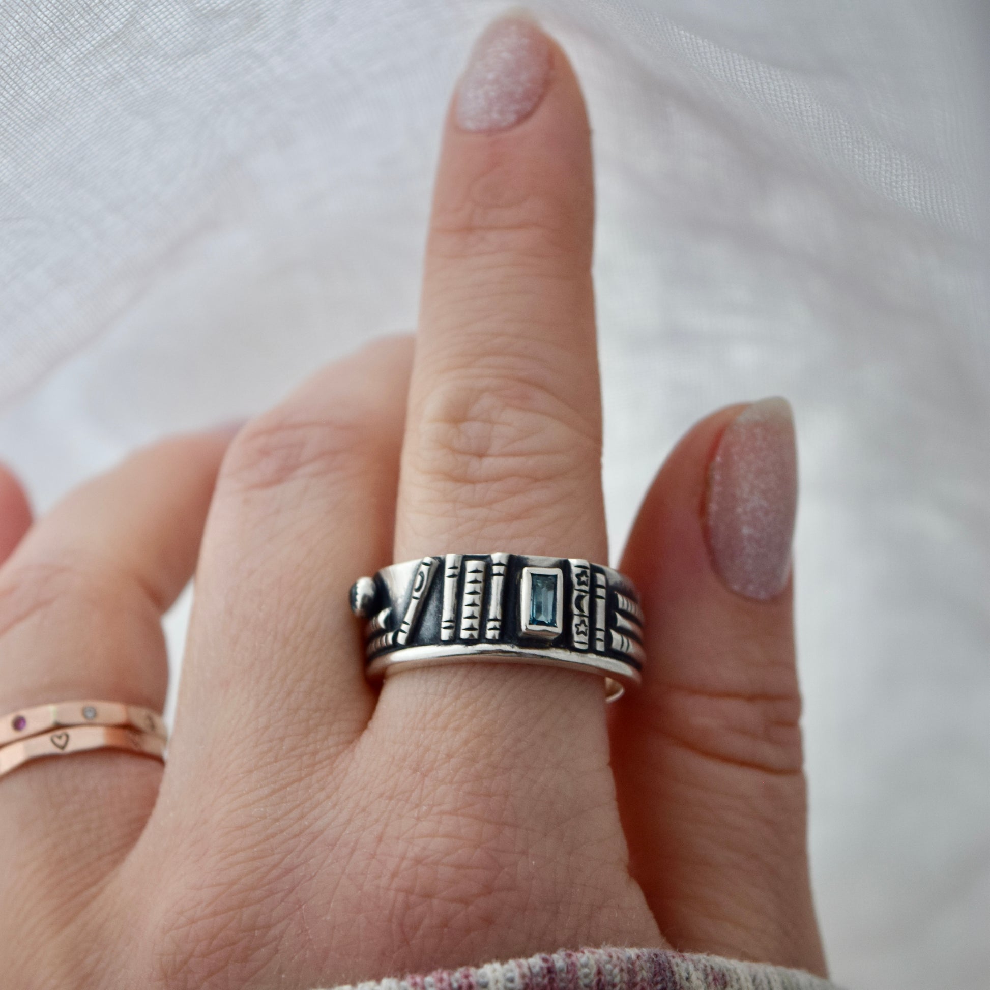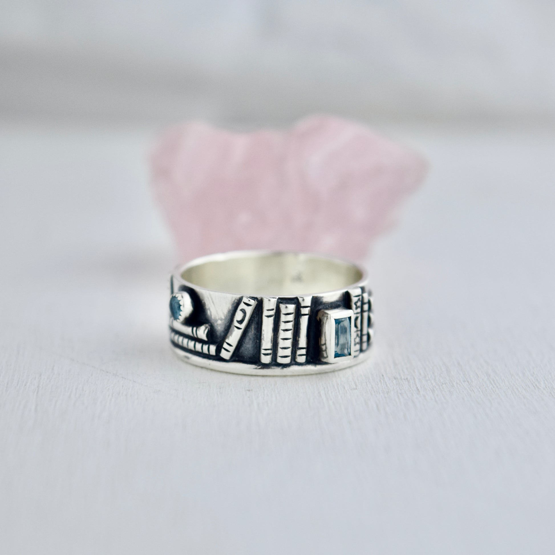 Bookshelf Ring Band with Blue Topaz and Blue Tourmaline Size 10.25