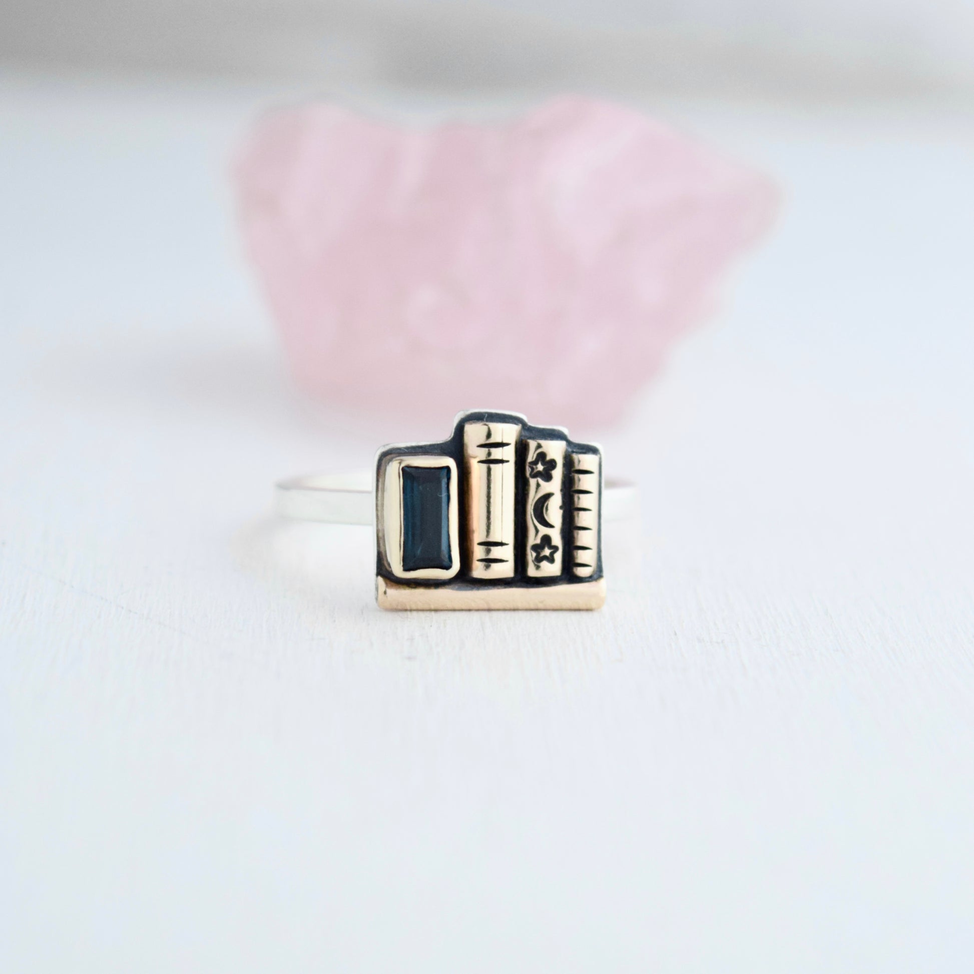 Mini Bookshelf Ring with Blue Topaz, 14k Solid Yellow Gold, and Gold Fill size 9
